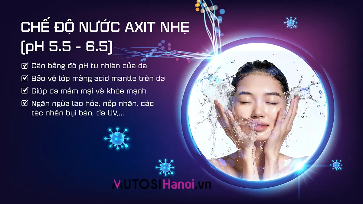 - Theo nghiên cứu của Hiệp hội Da liễu Hoa Kỳ (American Academy of Dermatology - AAD), da mặt chúng ta có một lớp màng axit mantle tự nhiên với độ pH khoảng 5.5. Khi rửa mặt bằng nước máy thông thường (có tính trung tính hoặc kiềm), các vi khuẩn, bụi bẩn và clo không nhìn thấy được trong nước có thể làm hỏng lớp màng này, dẫn đến tổn hại cho da. Ngược lại, sử dụng nước axit nhẹ đã được lọc qua hệ thống RO và điện phân giúp điều chỉnh độ pH về mức tương đồng với lớp axit tự nhiên trên da, giúp duy trì sự cân bằng tự nhiên cho da trong quá trình rửa mặt, ngăn ngừa tình trạng khô hoặc kích ứng da hiệu quả.