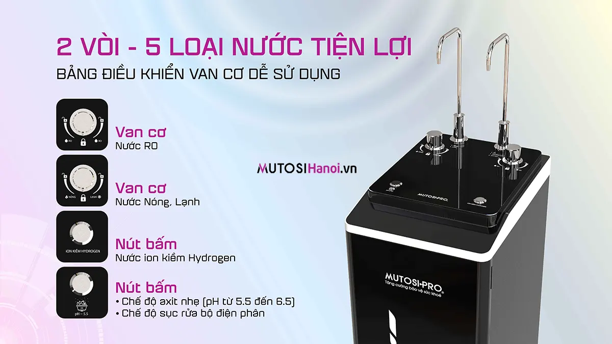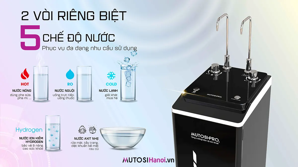 - 1 vòi lấy nước RO nguội, nước ion kiềm Hydrogen khoáng, hoặc nước axit nhẹ (pH 5.5 - 6.5)