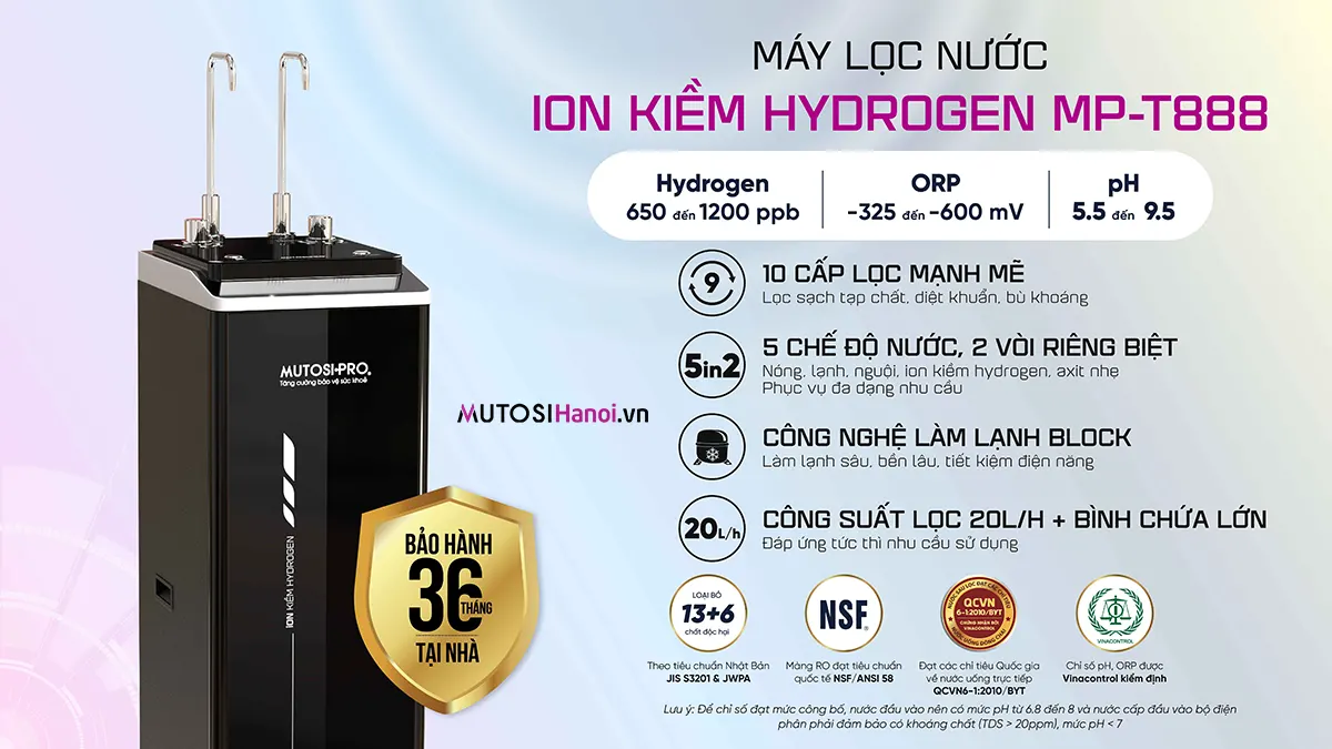 Máy lọc nước ion kiềm hydrogen Mutosi MP-T888 tạo ra nguồn nước giàu ion kiềm hydrogen với bộ chỉ số cân bằng lý tưởng: pH 8.0 - 9.5, ORP -325 đến -600mV, hydrogen 650 - 1200ppb mang theo nhiều lợi ích sống khỏe. Đồng thời MP-T888 còn có chế độ nước axit nhẹ (pH 5.5 - 6.5) - thường chế độ nước axit nhẹ chỉ xuất hiện ở những sản phẩm điện giải ion kiềm nhập khẩu cao cấp của Nhật Bản, Hàn Quốc, rất được ưa chuộng nhờ những công dụng hữu ích trong cuộc sống đặc biệt đối với chị em phụ nữ