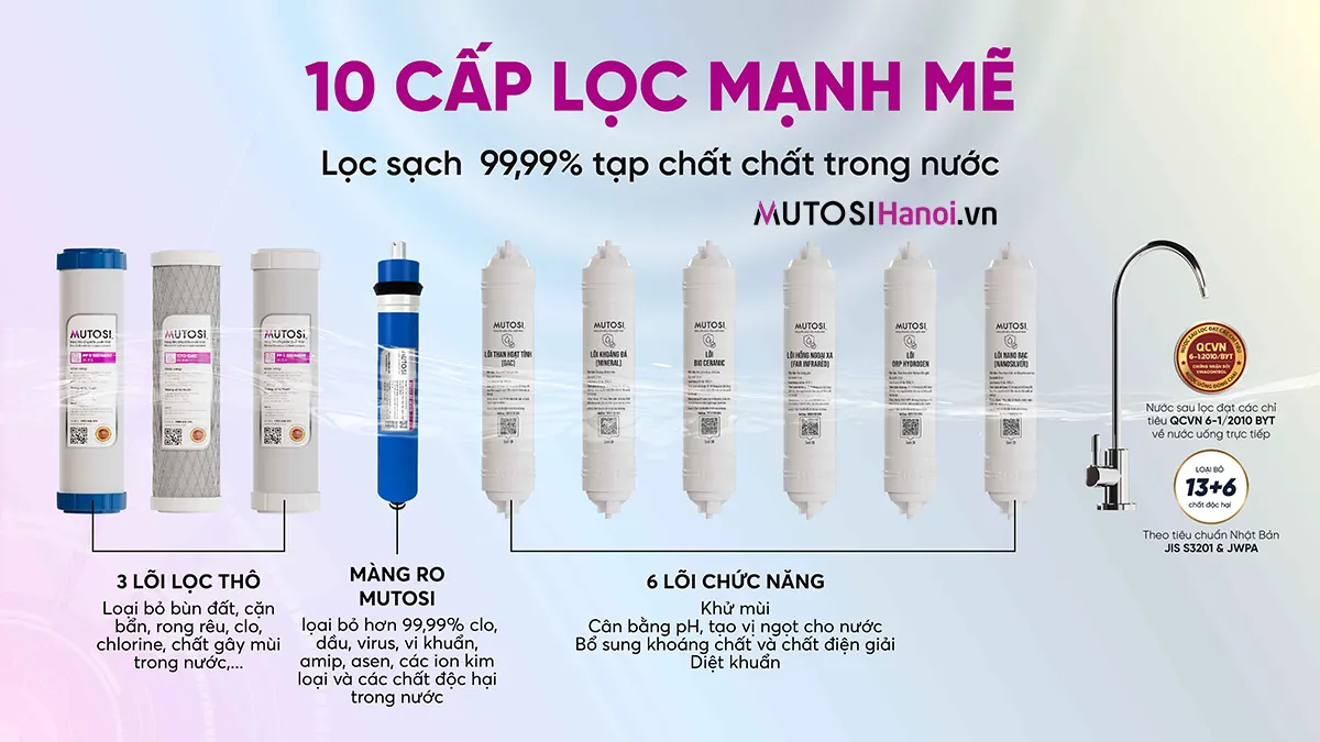 - Nước sau lọc loại bỏ 13+6 chất độc hại theo tiêu chuẩn JIS S3201 & JWPA NHẬT BẢN và đạt chuẩn uống trực tiếp QCVN6-1:2010/BYT CỦA BỘ Y TẾ