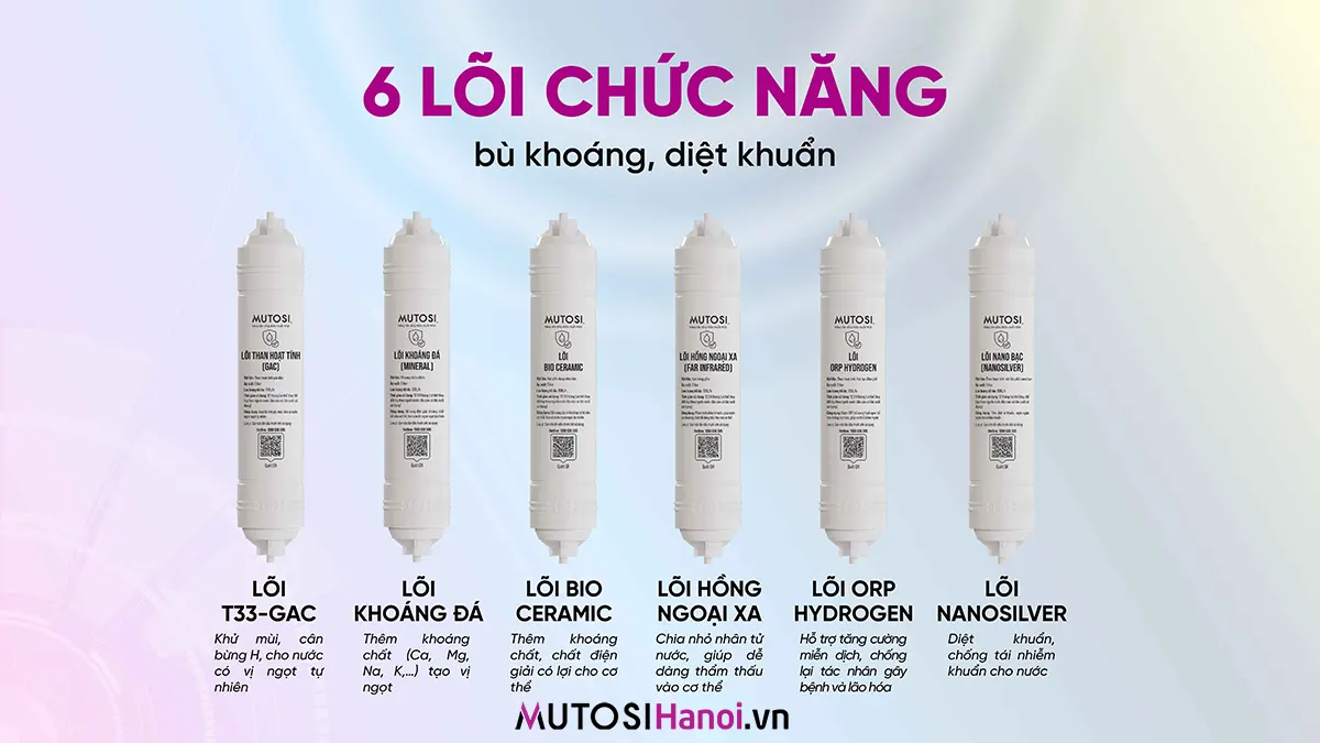 - 6 lõi chức năng bao gồm: lõi T33-GAC, lõi Hồng ngoại xa, Lõi ORP Hydrogen, Lõi Nano bạc kết hợp cùng Lõi Bio Ceramic & Lõi khoáng đá tăng hiệu quả khử mùi, diệt khuẩn, tăng thêm vị ngọt, bổ sung khoáng chất và chất điện giải có lợi cho sức khỏe
