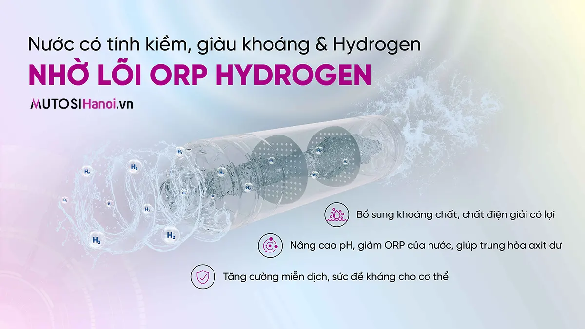 - Lõi ORP Hydrogen: Bổ sung các vi khoáng có lợi, làm tăng độ pH, giảm ORP của nước, hỗ trợ trung hòa axit dư, chống oxy hóa, tăng sức đề kháng cho cơ - thể