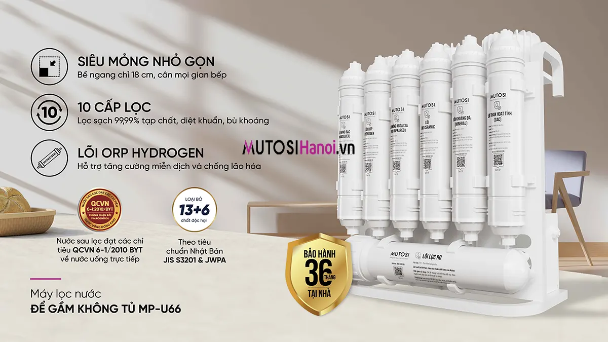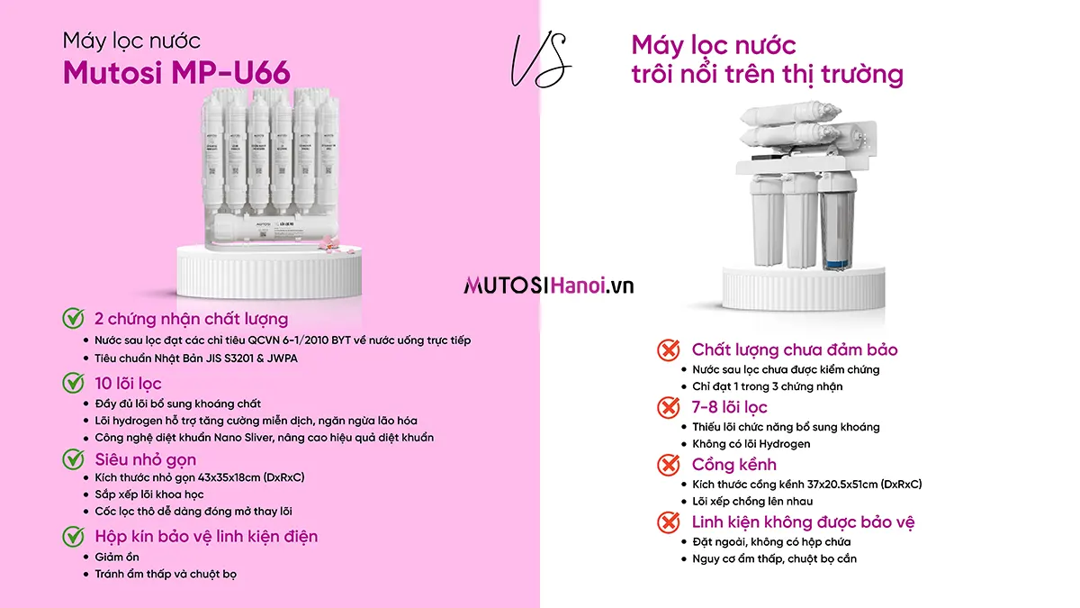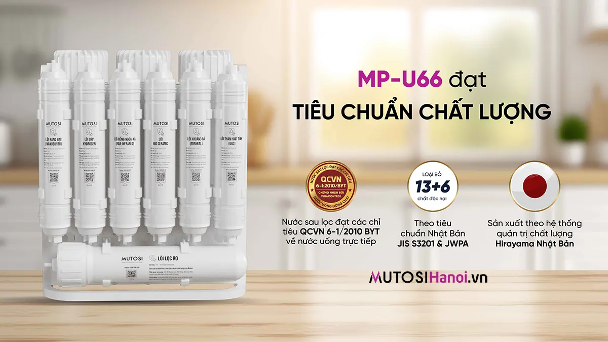 - Về chất lượng: MP-U66 tái tạo được nguồn nước đầu ra đạt đủ các tiêu chuẩn nước sạch theo QCVN6-1:2000/BYT của Việt Nam và tiêu chuẩn JIS S3201 & JWPA của Nhật Bản (Trong khi hầu hết các sản phẩm trôi nổi sẽ không công bố các kiểm chứng rõ ràng hoặc chỉ đạt được 1 trong số các tiêu chuẩn chất lượng trên)