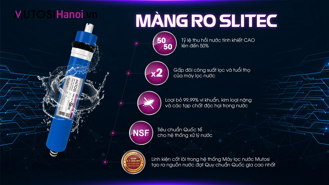 Màng lọc RO Slitec thương hiệu Mutosi, đạt tiêu chuẩn NFS/ANSI 58 cao cấp nhất bởi tổ chức NFS - Trung tâm hợp tác về An toàn thực phẩm và Nước uống thuộc Tổ chức Y tế Thế giới WHO.